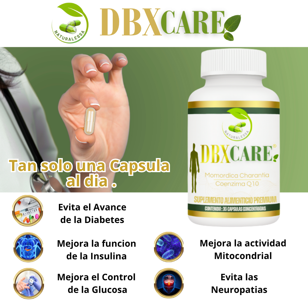 DBXCARE es un suplemento alimenticio 100% natural, formulado especialmente para apoyar el control de los niveles de glucosa en sangre. Su beneficio principal es ayudar a mantener la glucosa en rangos saludables y evitar los síntomas de las neuropatías.